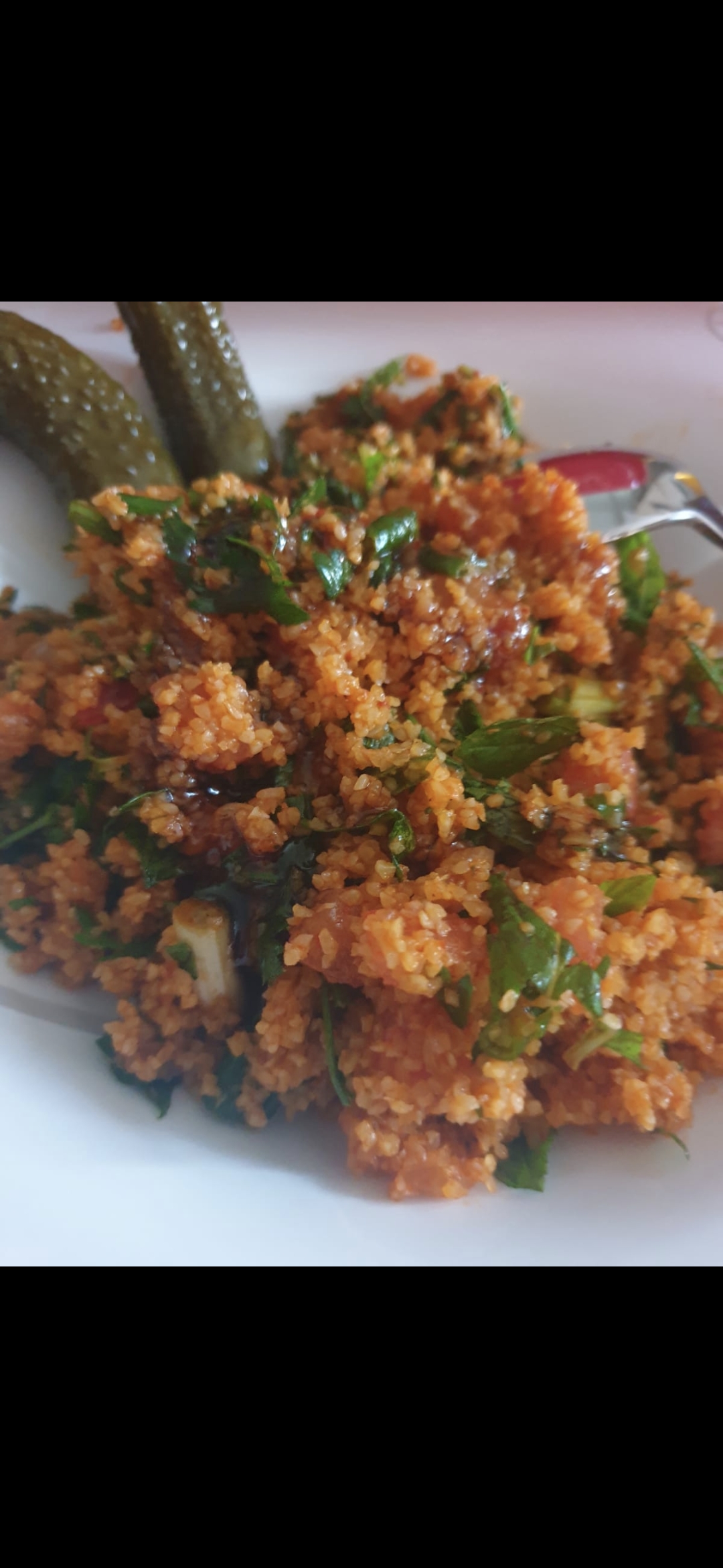 1. AdımKarıştırma kabına bulguru koyun üzerine sıcak su dökerek karıştırın yavaş yavaş(Bulgur ıslanana kadar)Kasenin üzerine tabak koyup ağzı kapalı şekilde 15 20 dakika bekletin.1 tane soğanı diri kalmayacak şekilde kavurun.Domates salçası ve biber salçasını ekleyip karıştırın.Maydonoz,nane,yeşil soğanı doğrayın.Beklettiğimiz bulgurun üzerine yeşillikleri koyup güzel bir şekilde karıştırdıktan sonra kavurduğumuz soğanı ekleyip son olarak zeytinyağı,kimyon,tuz,pul biber,karabiberini de ekleyin güzelce karıştırın.Üzerine nar ekşisi tercihen.