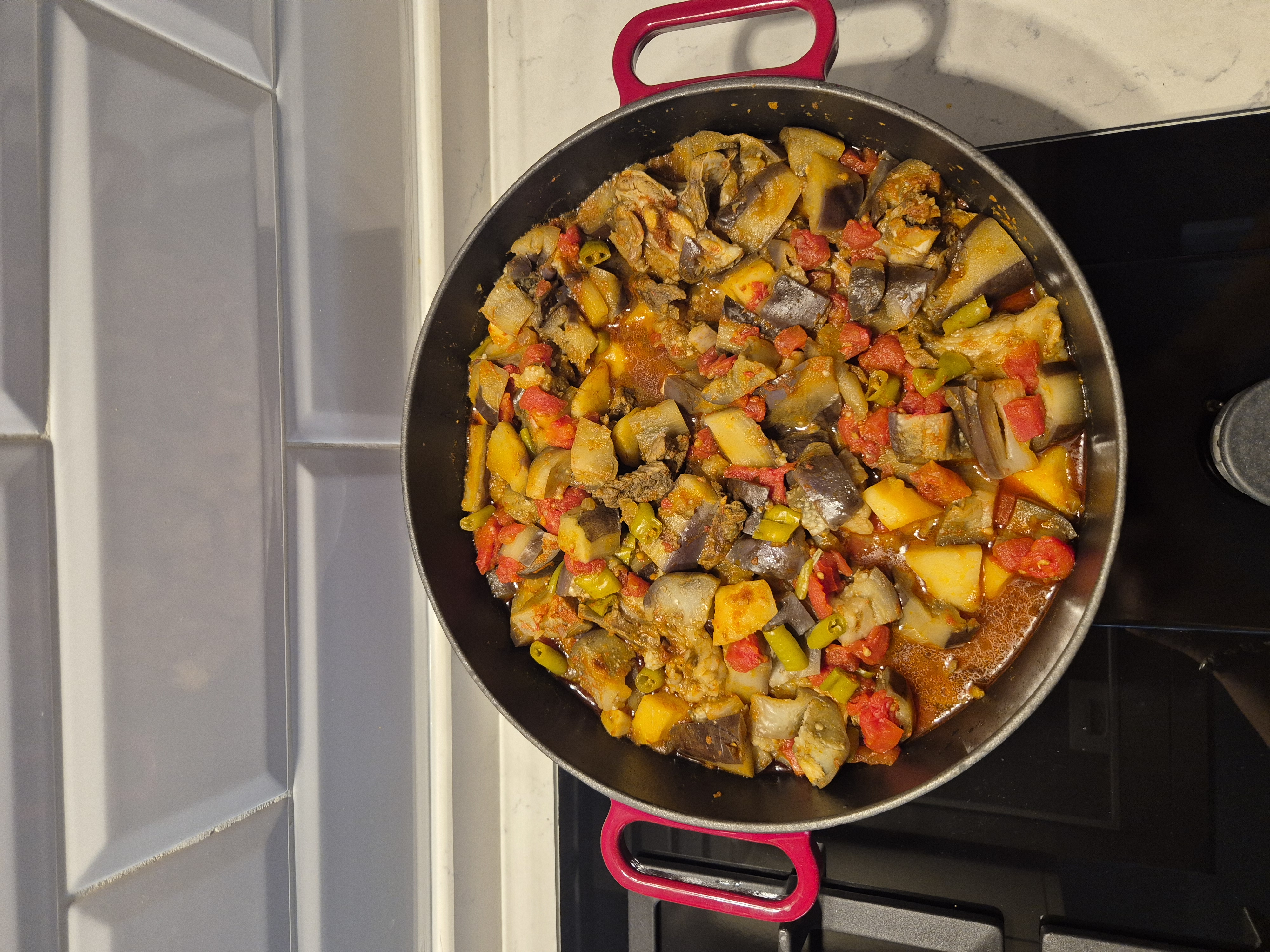 Patlıcanları kenarlarını araları boşluk kalacak sekilde kesin(çizgili olacak)Küp küp doğrayın tuzlu suda bekletin kararmasın.Diğer malzemeleri de doğradıktan sonra tencereye kuyruk yağını koyun yağını bıraktıktan sonra soğan ve sarımsağı ekleyin rengi dönene kadar karıştırın.Daha sonra etini ilave edin kavurup sırası ile patlıcanları,biber ve domateslerini ekleyin domates ve biber salçasını ekleyip kaynamaya bırakın.Kaynadıktan sonra altını kısın 45 dakika.Fırınlamak isterseniz son 15 dakika'da fırında pişirebilirsiniz