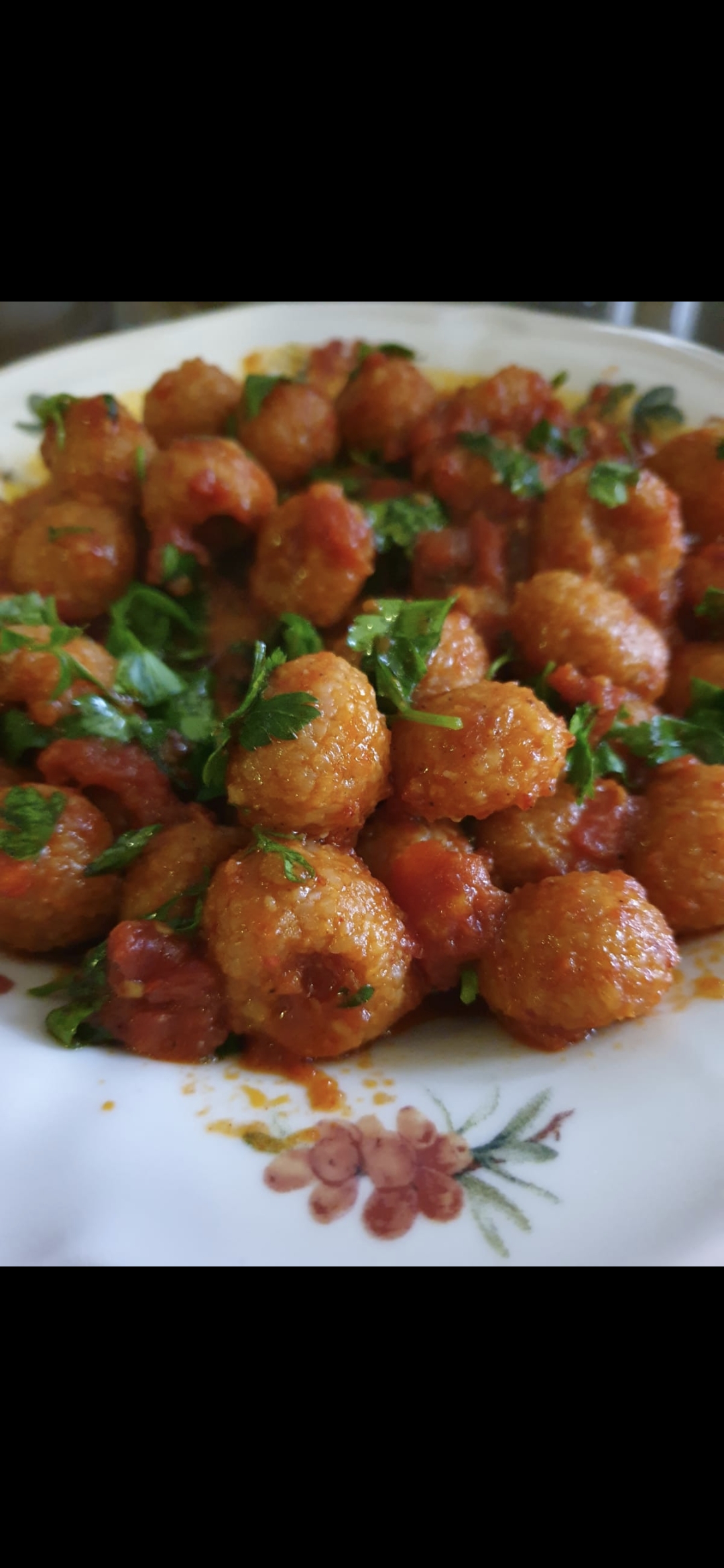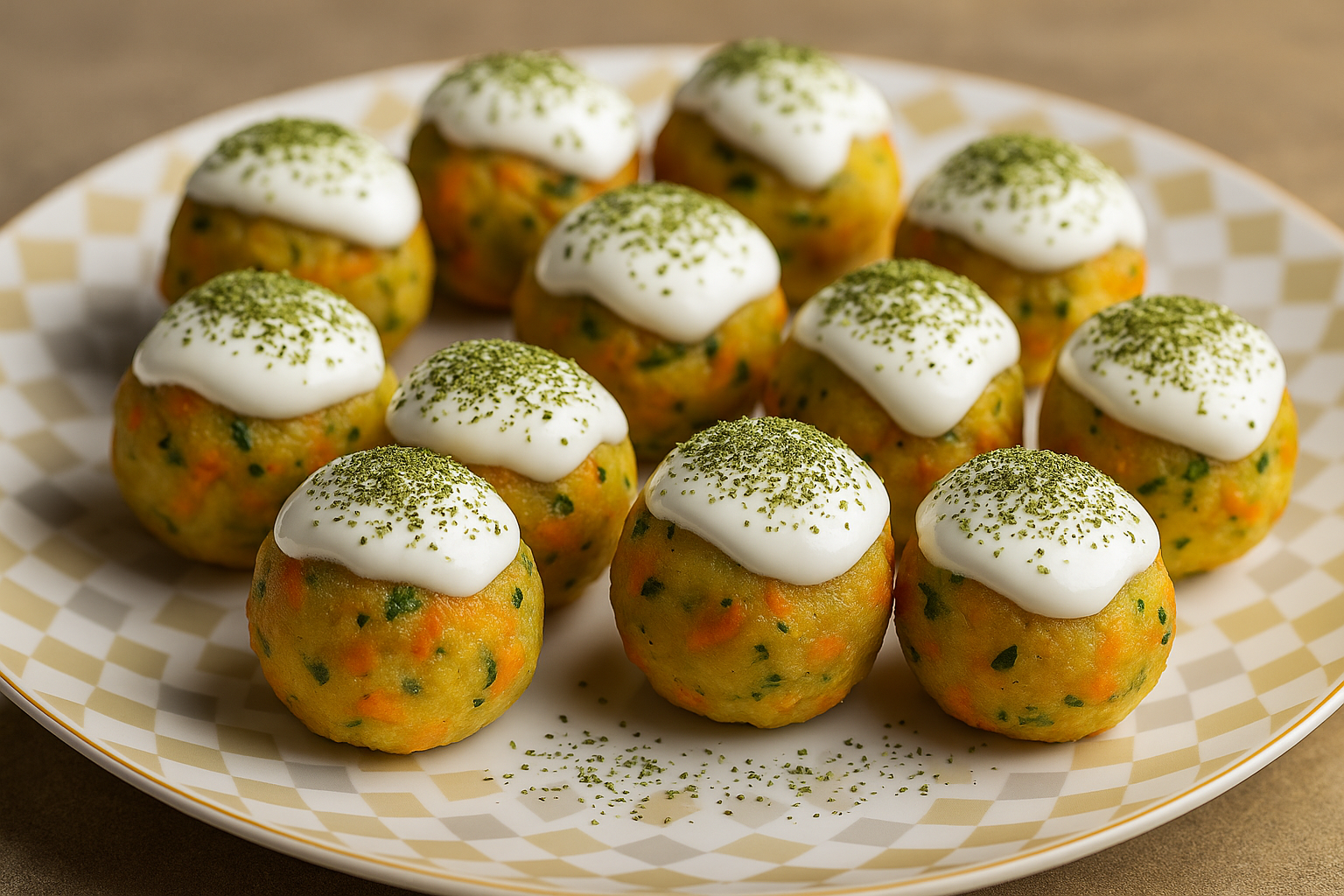 Patatesleri haşlayıp ezin. Rendelenmiş havuç, ince doğranmış maydanoz ve baharatları ekleyin. Karışımı yoğurun, ceviz büyüklüğünde toplar yapın. Yoğurtlu sosu hazırlayın, topların üzerine dökün. İ...