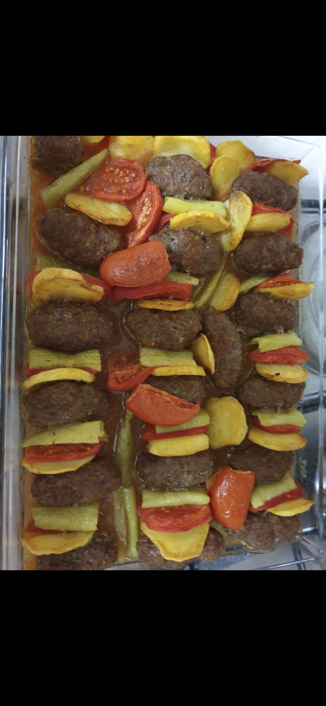 Tüm malzemeleri bir karıştırma kabında yoğur.Yoğurduktan sonra silindir şeklinde köfteler yapın.Patatesleri orta kalınlıkta yuvarlak bir şekilde doğrayın.Daha sonra önce köfteleri kızartıp kenara alın...