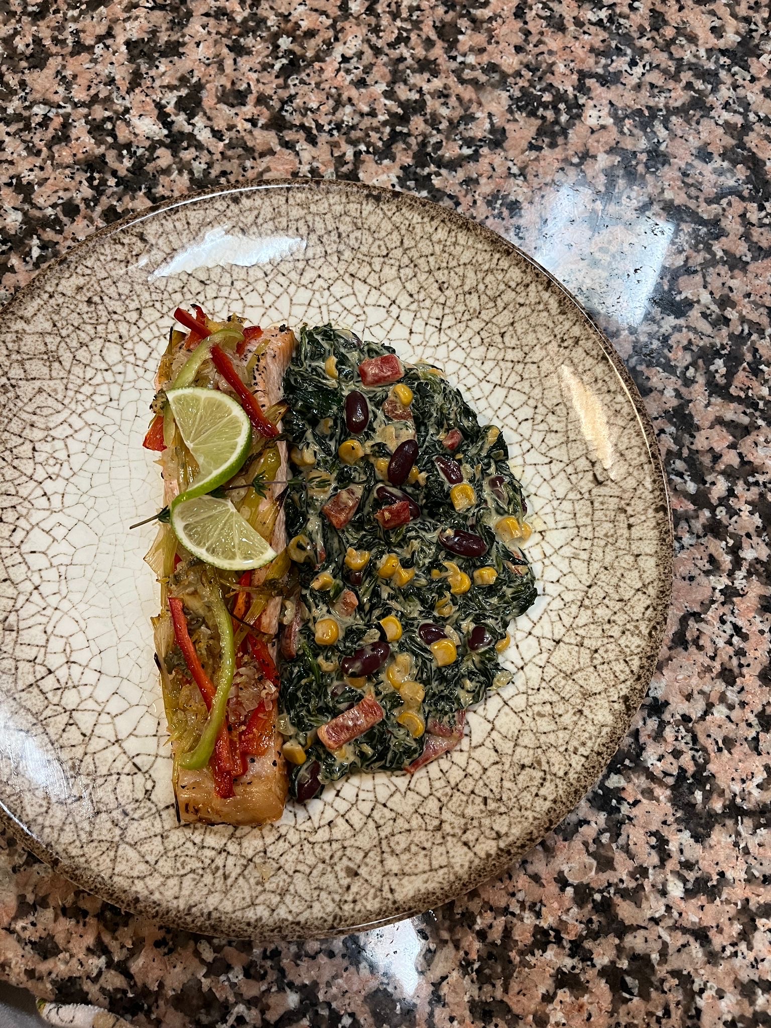 Fırını 180°C’ye ısıt. Sebzeleri bir kaba alıp zeytinyağı, sarımsak, tuz, karabiber ve kekikle harmanla. Fırın tepsisine yağlı kağıt ser ve sebzeleri yerleştir. Somon filetoları sebzelerin üze...
