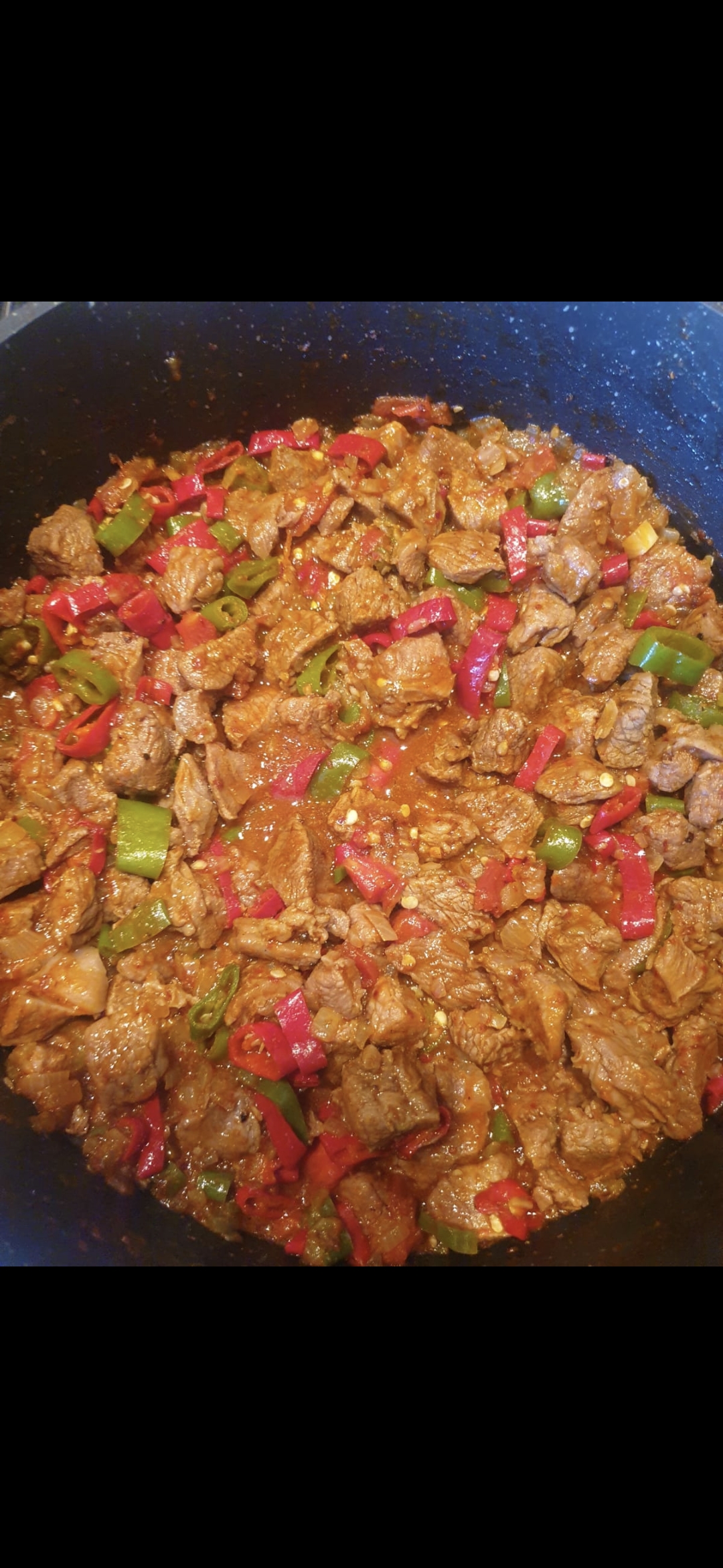 Tencere'ye eti alıp karıştırın suyunu bırakıp kaynamaya başladıktan sonra altını kışın.Suyunu çektikten sonra zeytinyağını döküp soğan ve sarımsağını ekleyin karıştırın.Daha sonra kırmızı biberi ve yeşil biberi,tuz,karabiber,pul biberi ekleyin Ardından domatesini ekleyin pistikten sonra altını kapatın.