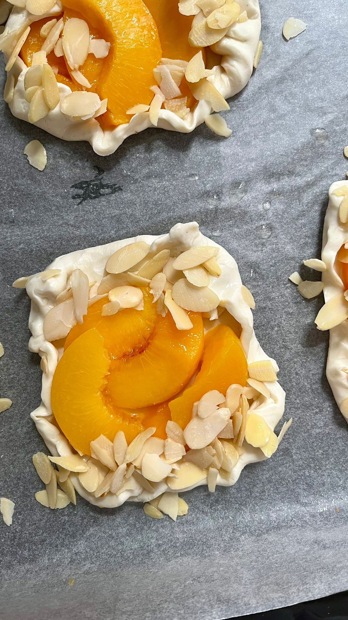 2. AdımŞeftalileri doğrayıp kaynar su içine 30 saniye kadar daldırıp çıkarıp soğuk suyla yıkayın. Süzüp soğuttuktan sonra toz şekerle iyice karıştırın. Açtığınız hamur içine yerleştirip üzerine file bademleri ekleyin.