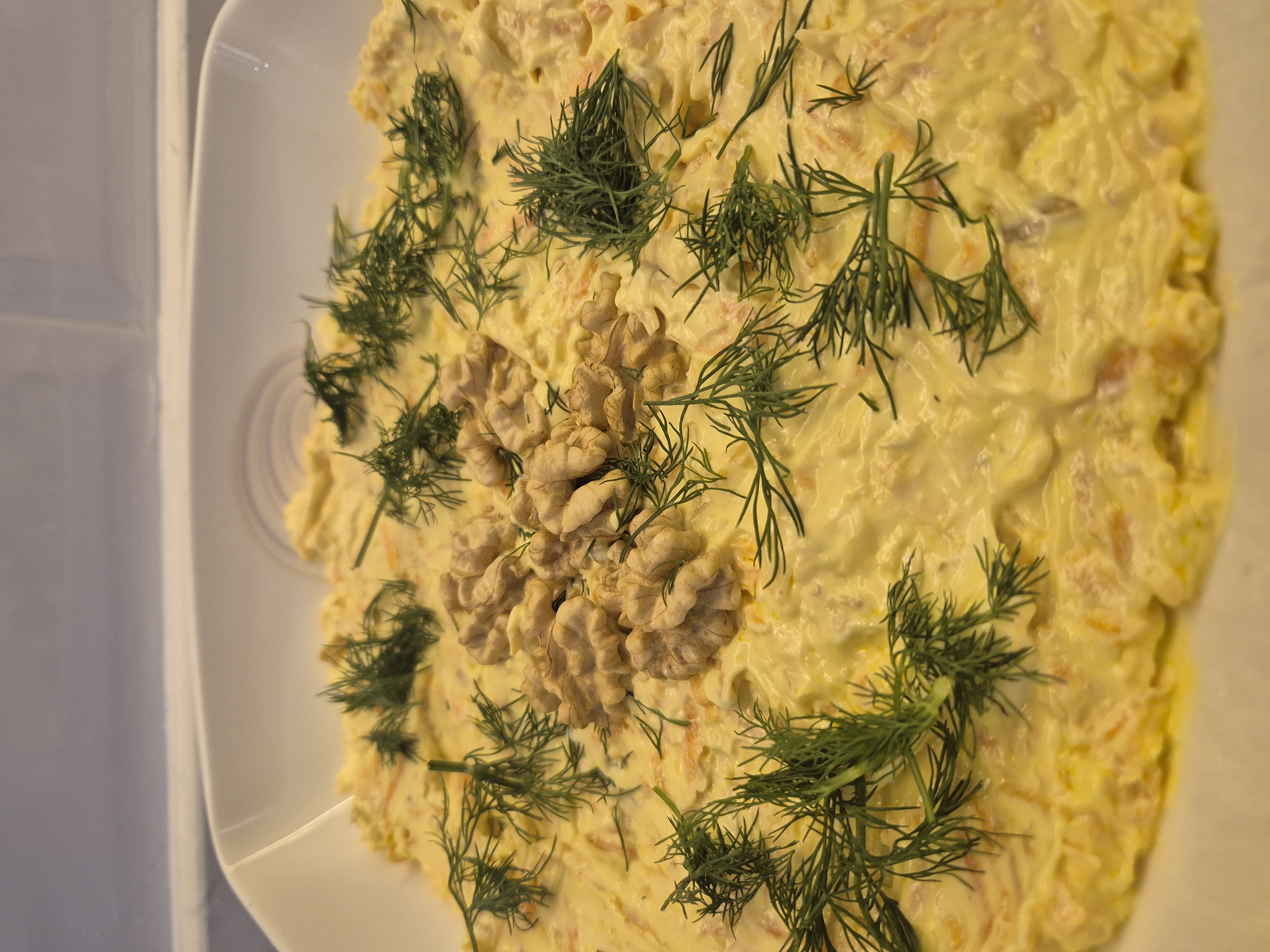 Havuçları rendeleyin daha sonra zeytinyağını tavaya koyun biraz kızdırdıktan sonra havuçları ekleyin ve kavurun.Daha sonra kase'nin içine alın soğumaya bırakın.Başka bir kasede süzme yoğurdunu özeyin çok cıvık ve cok katı olmayacak şeklinde.Yoğurdun içine havuçları,1 diş ezilmiş sarımsak,bir avuç kırılmış ceviz ve mayonezi ekleyip güzelce boca edin.Servis kasesine alın Üzerine dereotu ve ceviz koyun..