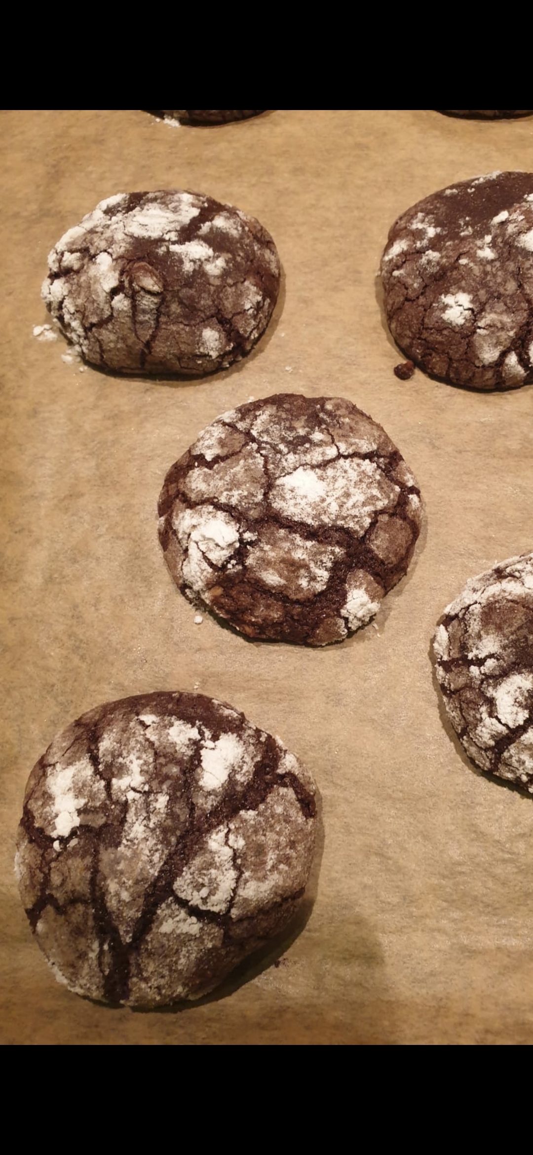1. AdımUfak boy bir tencerede tereyağını eritin.Ocaktan alıp içine çikolatalarını ekleyip eriyene kadar karıştırın.Bir kasede un,kabartma tozu,kakao,karbonat,tuz ve kahvenizi harmanlayın.Bir çırpma kabında yumurtaları şeker ve vanilya ile sadece karışana dek çırpın içine eritilmiş çikolatalı tereyağ karışımını ekleyin,hemen ardından da kuru karışımı ekleyin.En son 5 yemek kaşığı unuda ekleyip hamur haline gelir gelmez streçleyip buzdolabında 2 saat soğumaya bırakın.Bir tabakta pudra şekeri ve toz şekeri harmanlayın hamurdan 25'er gr toplar kopartıp yuvarlayın.Hamur cıvık olabilir arada bir elinizi yıkayıp kurulayıp devam edebilirsiniz.Ònce şekere bulayıp sonra tepsiye aralıklı olarak dizin.180° 13 dakika